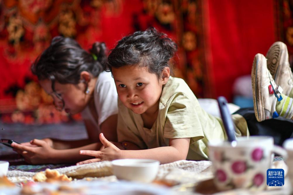 在索爾巴斯陶牧場過暑假的艾麗達(右)和姐姐在房間內玩耍(8月14日攝)。