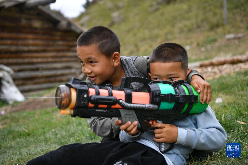 7歲的木巴拉克(左)和表弟一起在索爾巴斯陶牧場上過暑假(8月12日攝)。