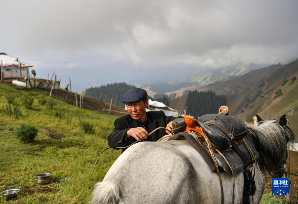 在新疆昌吉市廟爾溝鄉(xiāng)索爾巴斯陶牧場上,一名牧民整理鞍具,準(zhǔn)備外出放牧(8月14日攝)。