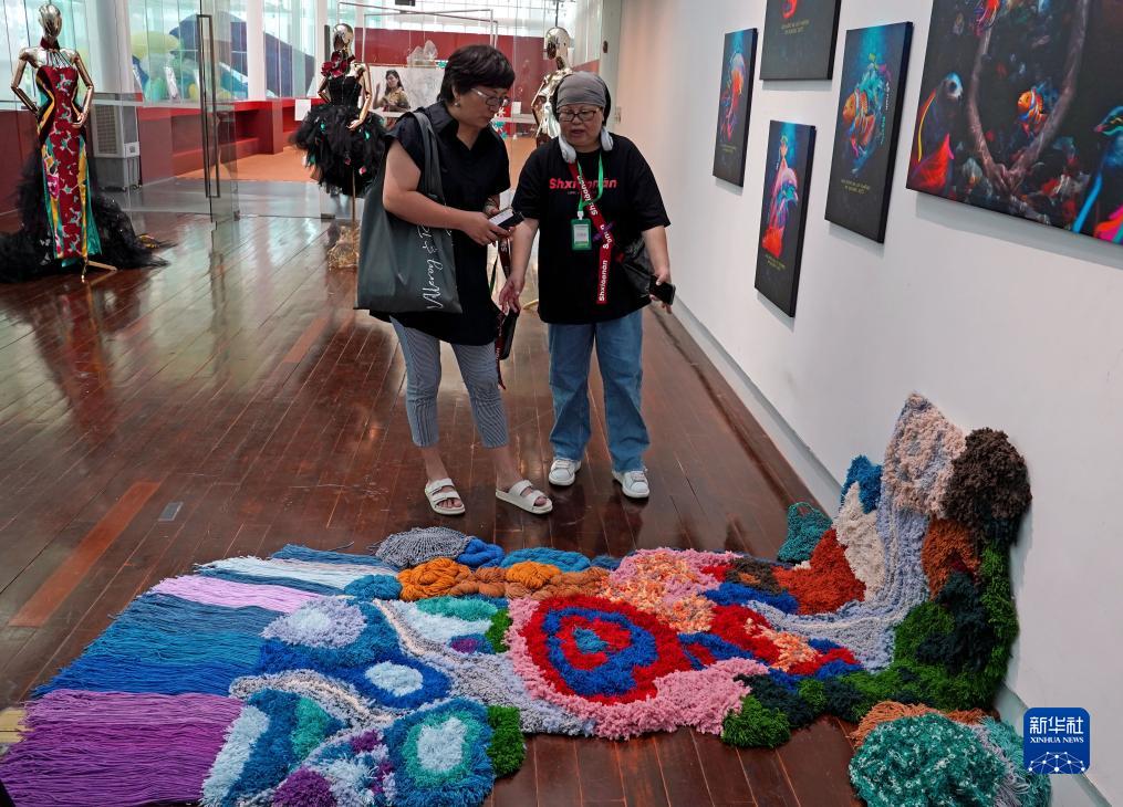 藝術節現場展示的手工作品《青山綠水》(8月15日攝)。該作品由設計師和海派鉤針編結非遺傳承人共同創作,呼吁人們保護山河草木。