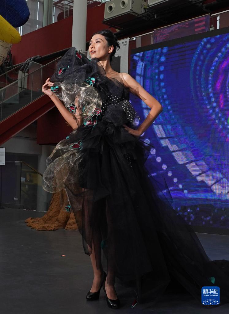 8月15日,模特在藝術節開幕式上展示用廢棄布料設計制作的禮服。