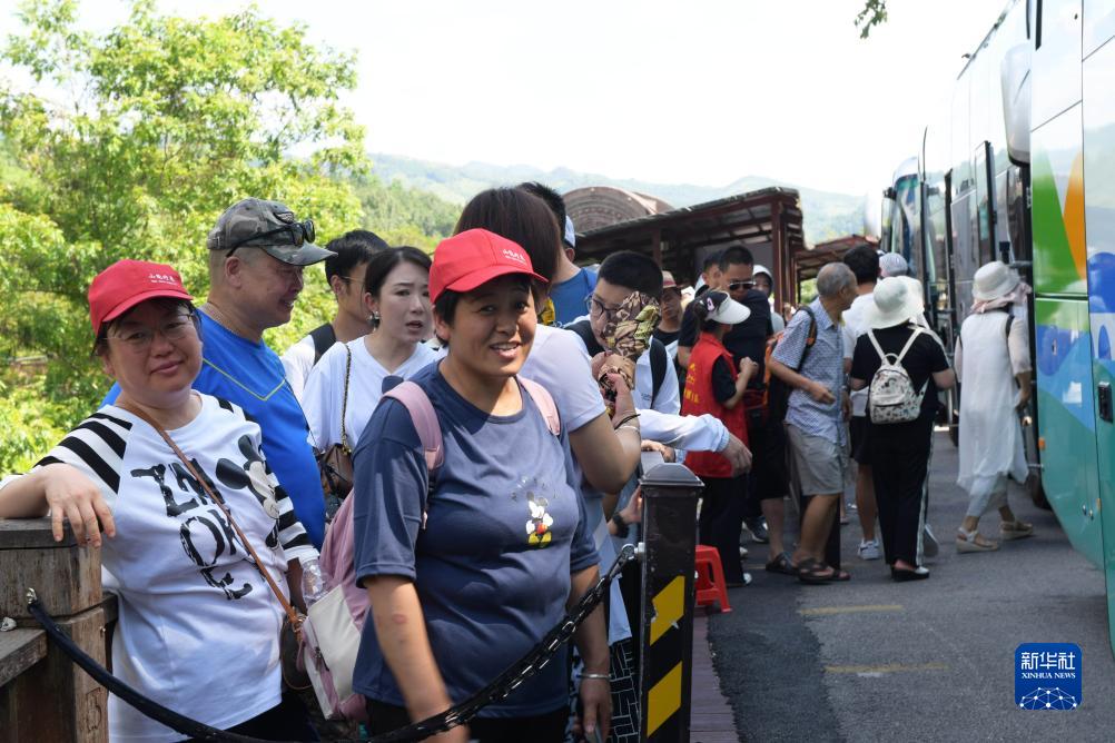 8月15日,游客在貴州省荔波小七孔風景區(qū)有序等候乘車。