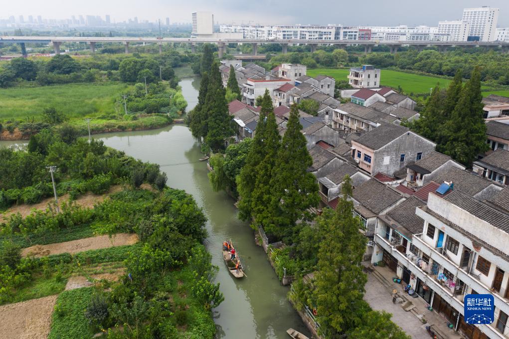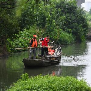 8月15日,在織里鎮港西村楊家埭河段,黨員志愿者和村民在河道做日常水體保潔(無人機照片)。