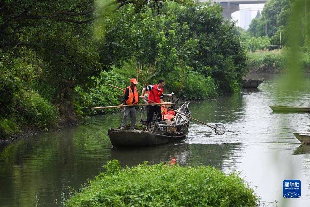 8月15日,在織里鎮(zhèn)港西村楊家埭河段,黨員志愿者和村民在河道做日常水體保潔。