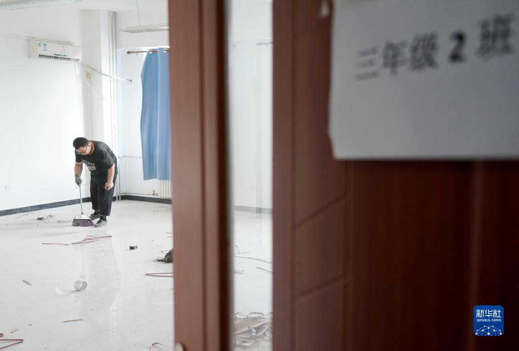 8月14日,北京市門頭溝區(qū)京師實(shí)驗(yàn)中學(xué)工作人員在打掃新布置的教室,以迎接借址開(kāi)學(xué)的師生。