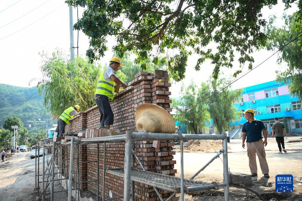 8月15日,工人在北京市房山區河北鎮中心幼兒園東莊子分園重建被洪水沖毀的園墻。