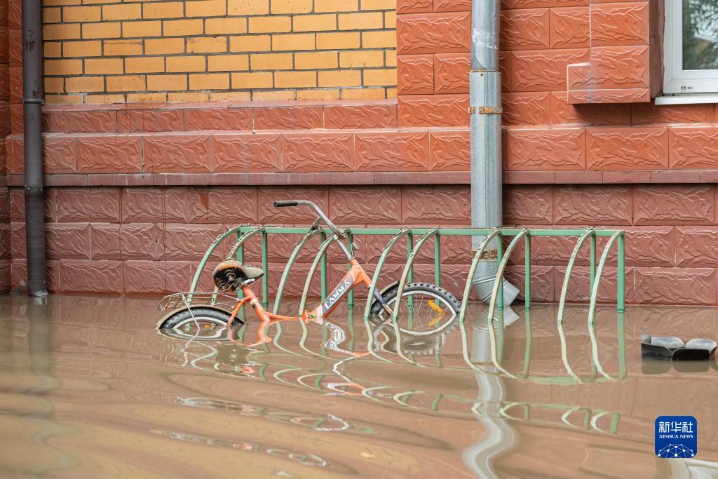 這是8月15日在俄羅斯烏蘇里斯克市拍攝的泡在洪水中的自行車。