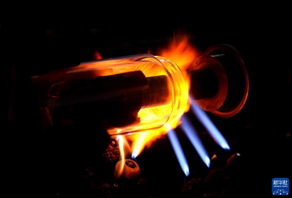 這是8月15日在山東省淄博市沂源縣悅莊鎮(zhèn)東埠村一玻璃制品企業(yè)拍攝的玻璃工藝品燒制加工場(chǎng)景。