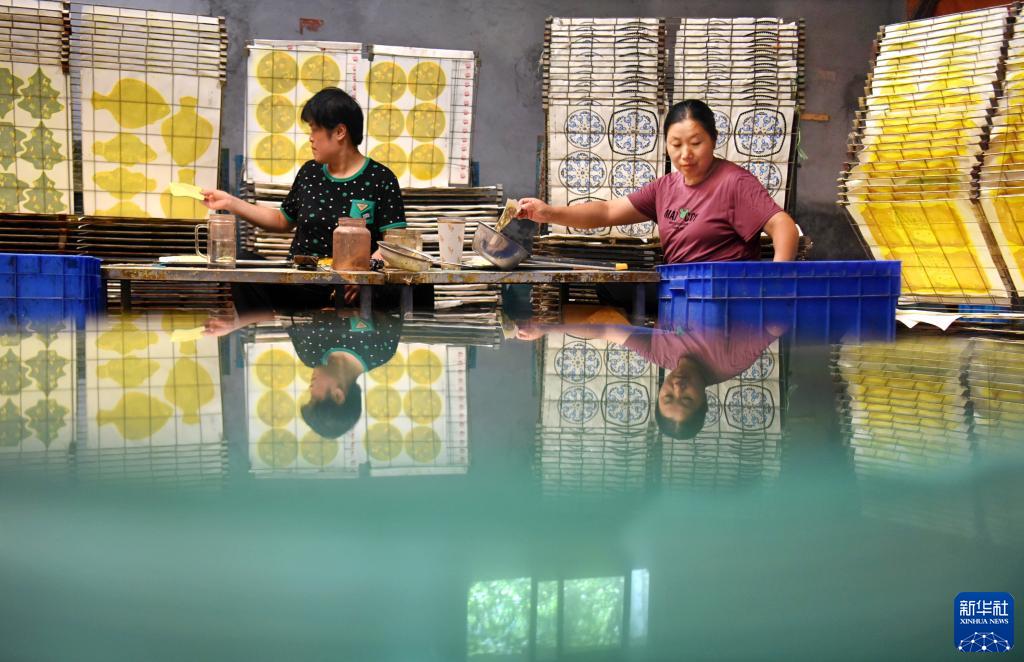 8月15日,在山東省淄博市沂源縣悅莊鎮東埠村一玻璃制品企業,工人對玻璃進行貼畫加工。