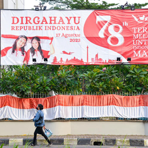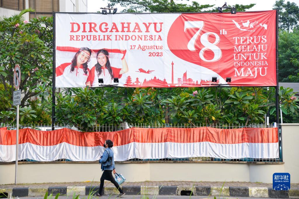 8月15日,在印度尼西亞雅加達(dá),行人經(jīng)過獨(dú)立日宣傳海報(bào)。