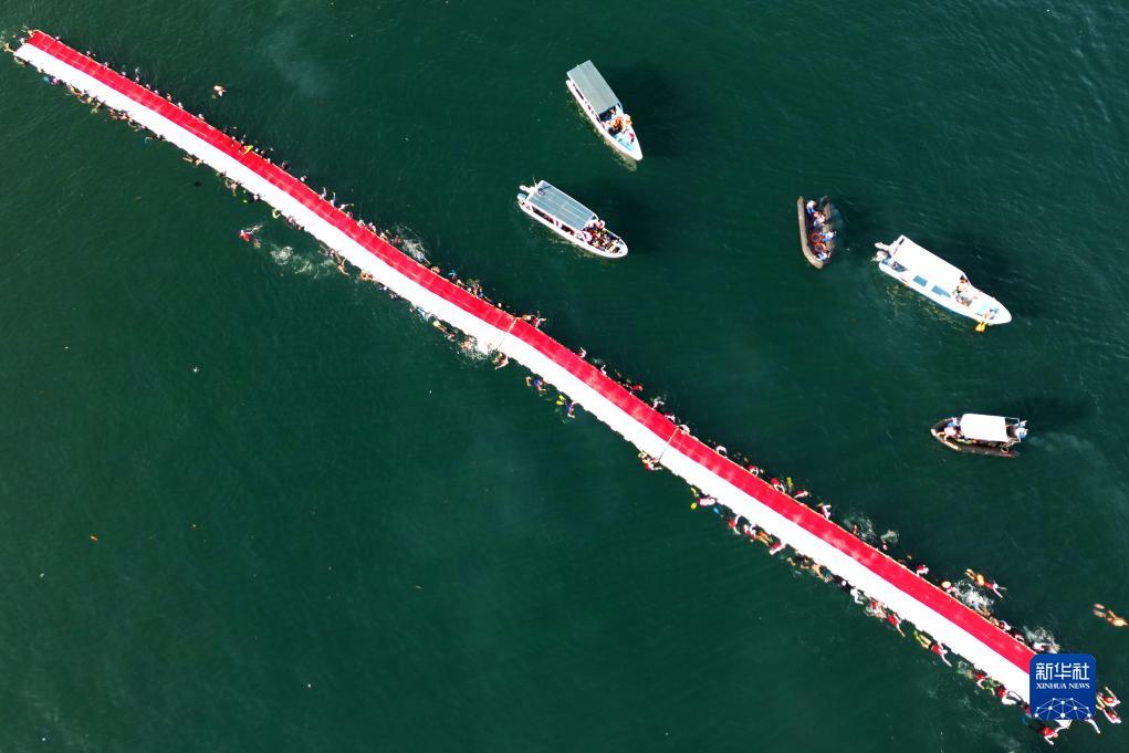 8月12日,在印度尼西亞望加錫海邊,人們游泳展開一張長達78米的巨幅印尼國旗(無人機照片)。