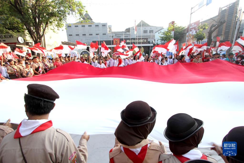 8月13日,在印度尼西亞梭羅,學(xué)生們?cè)诮诸^舉著巨幅印尼國(guó)旗迎接獨(dú)立日。