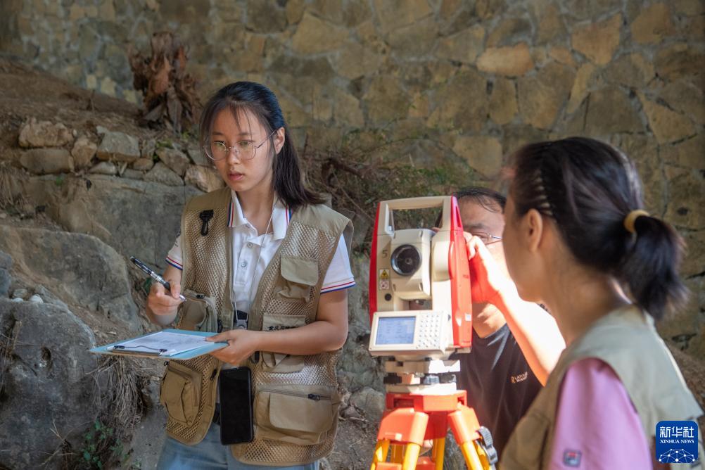 8月16日,工作人員在位于重慶市巫山縣廟宇鎮的龍骨坡遺址上開展勘測工作。