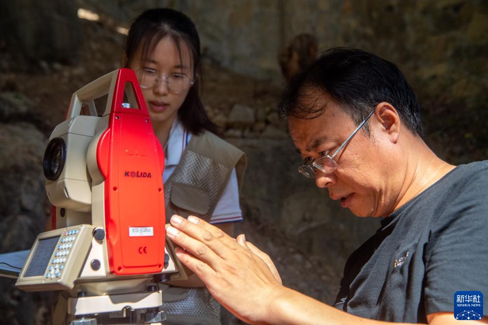 8月16日,工作人員在位于重慶市巫山縣廟宇鎮的龍骨坡遺址上開展勘測工作。