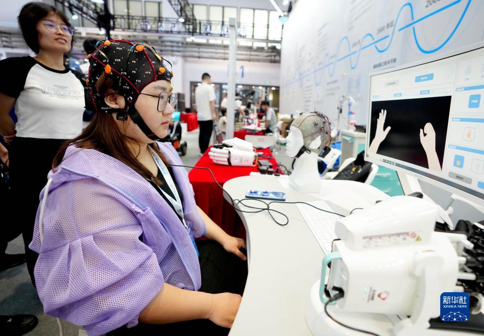 8月16日,工作人員在演示腦機接口智能治療系統平臺。該機器人應用于中風患者手部康復治療。