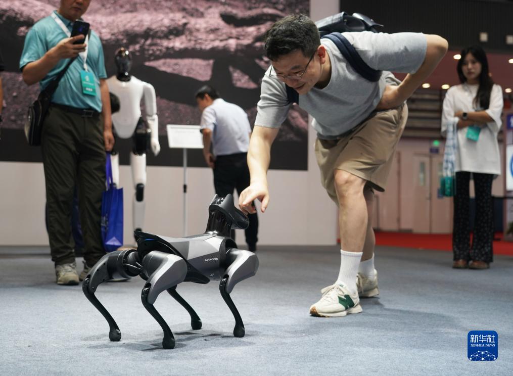 8月16日,觀眾在2023世界機器人大會現場與一款仿生四足機器人互動。