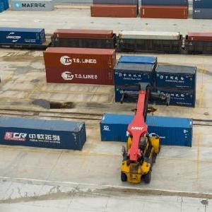 8月14日,在江西省贛州市南康家具智能備料中心,工作人員操作車輛運送木料。