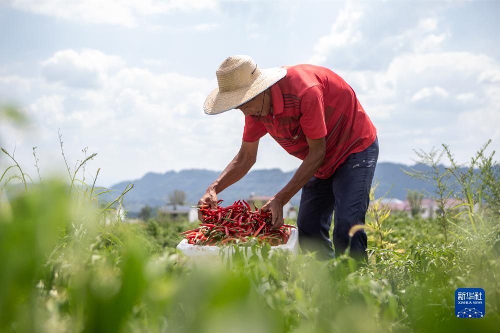 8月15日,村民在重慶市石柱土家族自治縣龍沙鎮(zhèn)長(zhǎng)坪村辣椒種植基地收獲辣椒。