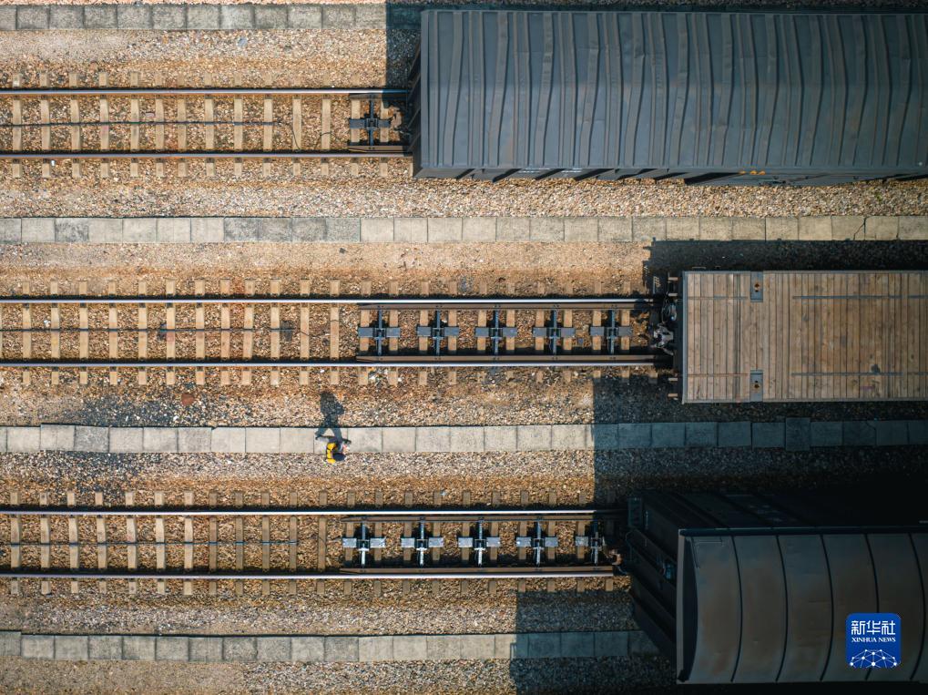 8月16日,鐵路喬司編組站的調車員走向貨車車廂準備進行調車作業(無人機照片)。