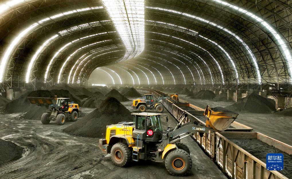 8月16日,在中聯(lián)鐵運(yùn)(井陘)儲(chǔ)備基地環(huán)保大棚,機(jī)械設(shè)備進(jìn)行煤炭裝車(chē)作業(yè)。