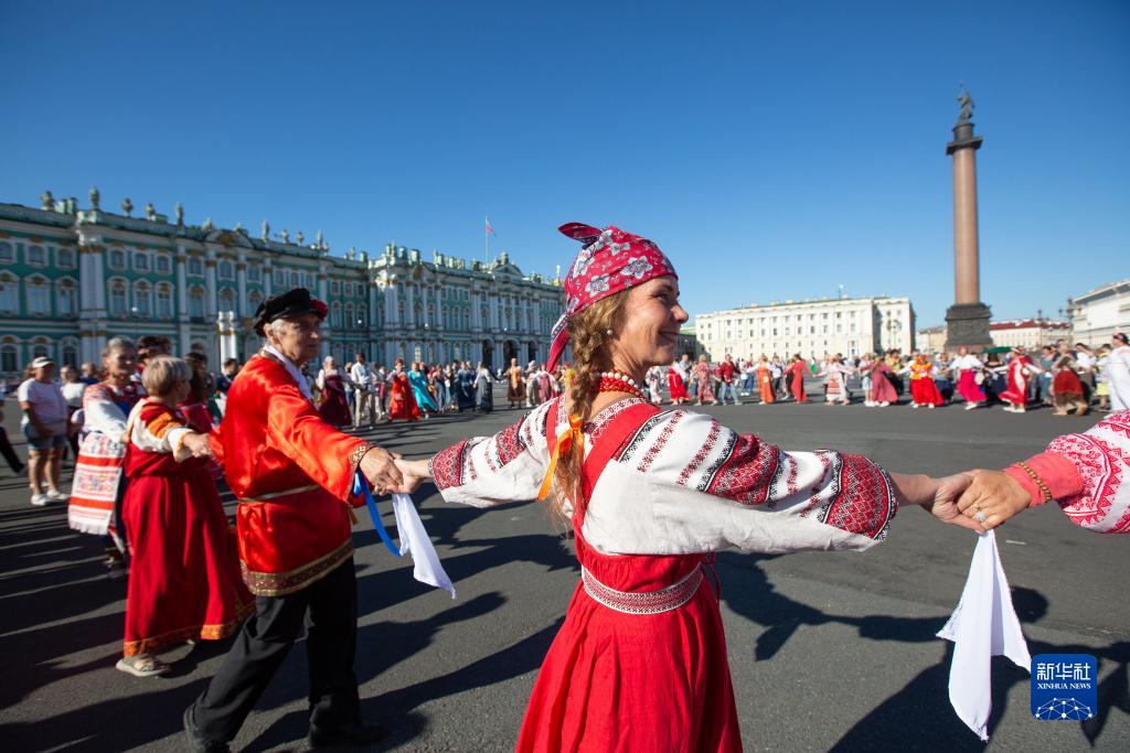 8月15日,民眾在俄羅斯圣彼得堡冬宮廣場跳圓圈舞。