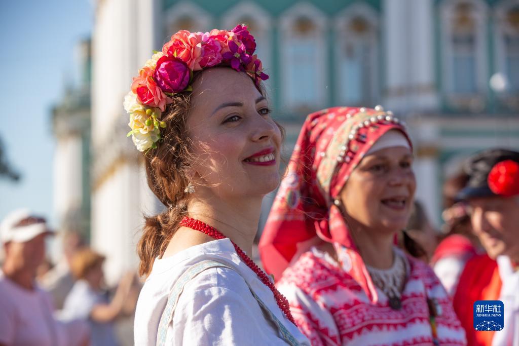 8月15日,民眾在俄羅斯圣彼得堡冬宮廣場跳圓圈舞。