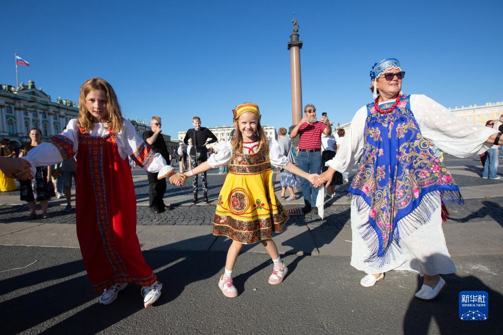 8月15日,民眾在俄羅斯圣彼得堡冬宮廣場跳圓圈舞。