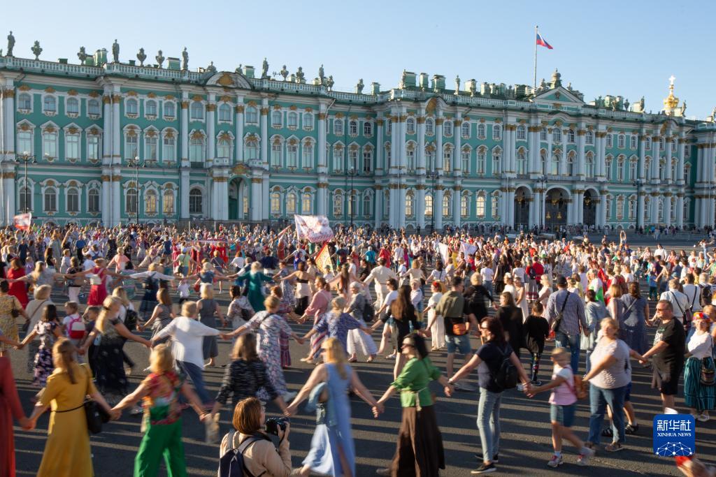 8月15日,民眾在俄羅斯圣彼得堡冬宮廣場跳圓圈舞。
