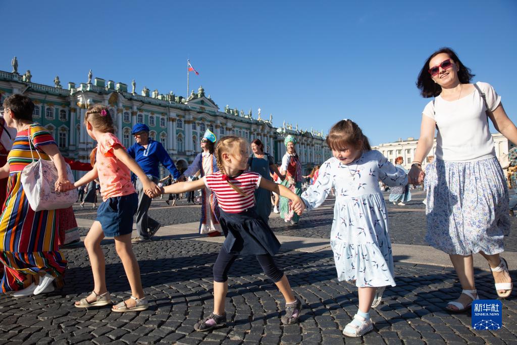 8月15日,民眾在俄羅斯圣彼得堡冬宮廣場跳圓圈舞。