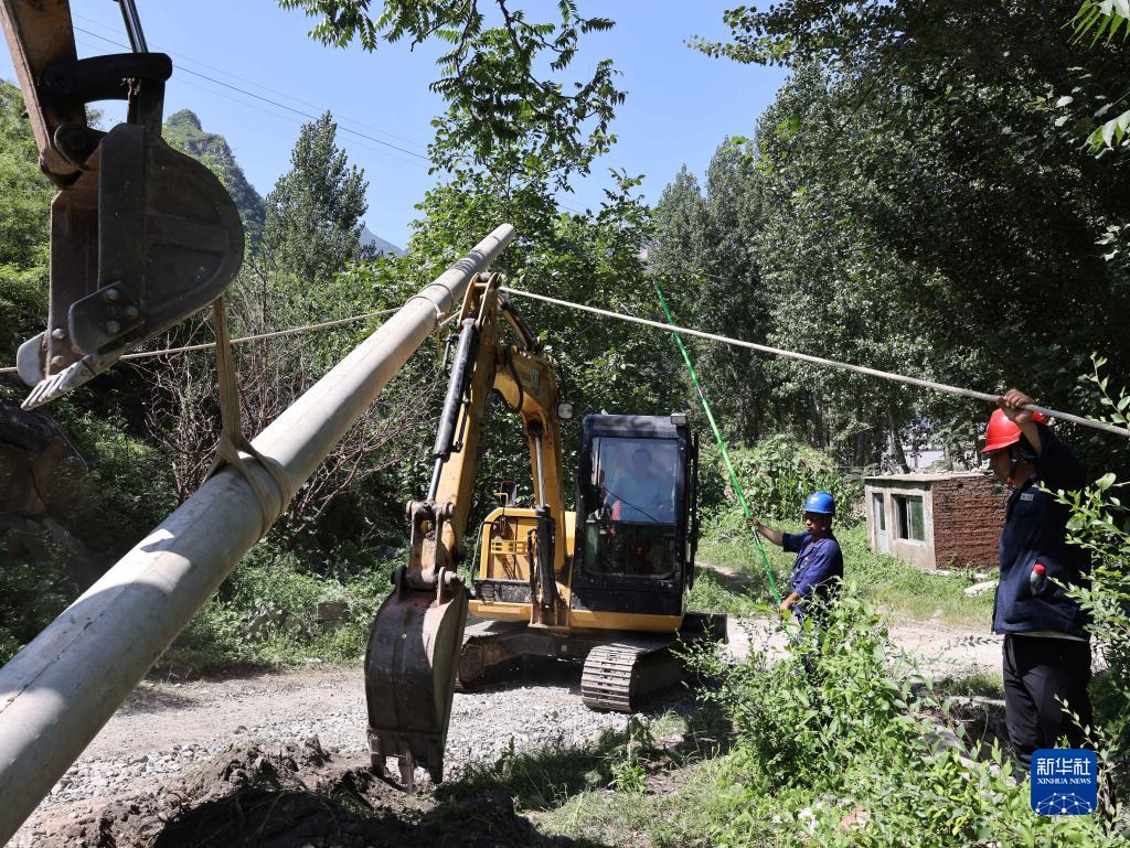 8月16日,電力公司施工人員在河北淶水縣九龍鎮北龍門村搶修電力設施。