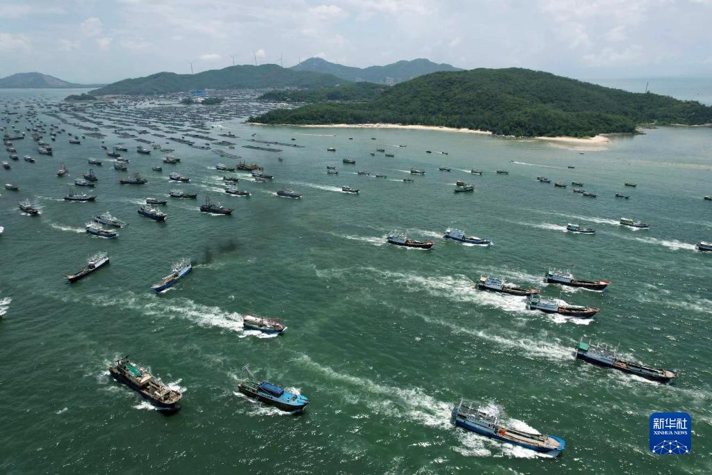 8月16日,漁船駛離廣東省陽江市閘坡國家級中心漁港(無人機照片)。