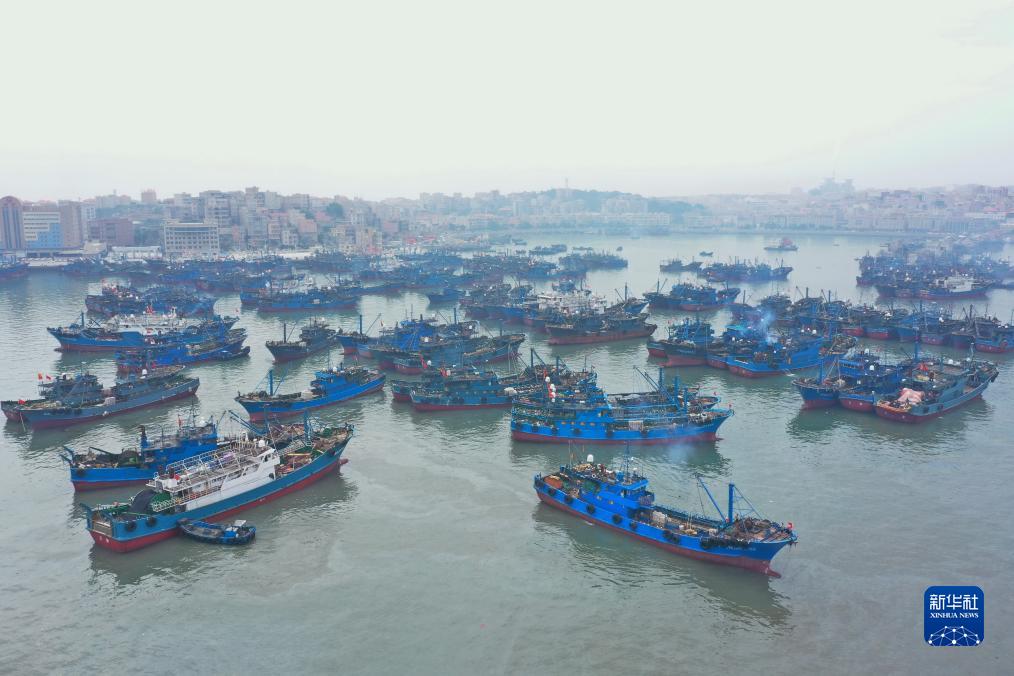 8月16日,漁船在福建泉州市石獅祥芝國家中心漁港準備出海(無人機照片)。