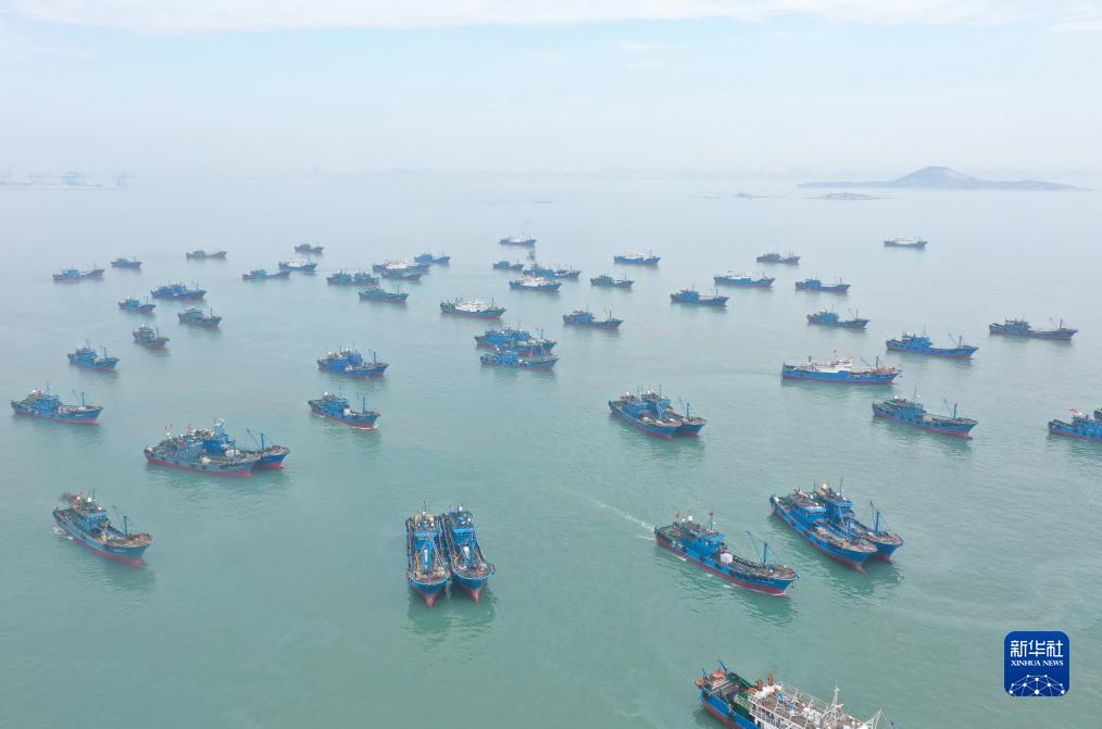 8月16日,漁船從福建泉州市石獅祥芝國家中心漁港出海(無人機照片)。