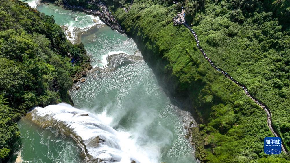 8月16日,游客在貴州省安順市黃果樹瀑布景區(qū)游覽(無人機照片)。