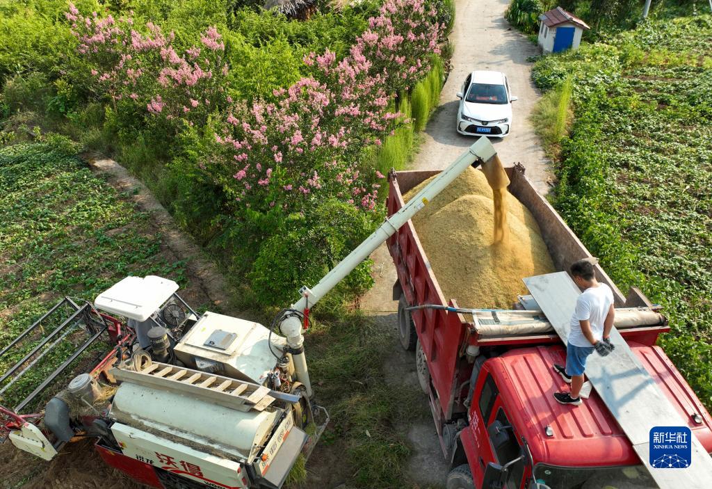 近日,四川東部廣安市近200萬畝水稻進入成熟收獲期,農民在田間忙碌,收獲水稻。