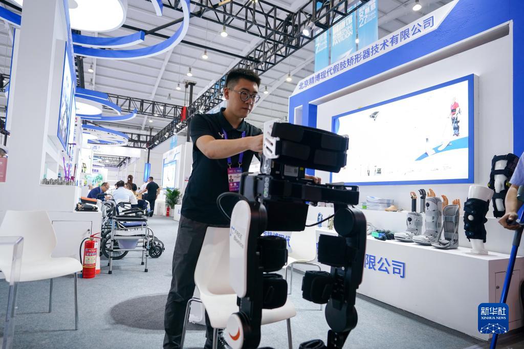 8月16日,參展商在第七屆中國—南亞博覽會上展示下肢外骨骼助行輔具。 新華社記者 陳欣波 攝