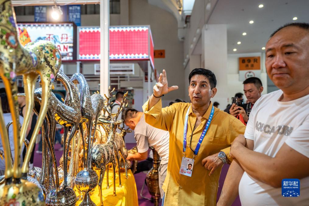 8月16日,參展商(左)在第七屆中國—南亞博覽會巴基斯坦展區(qū)推介特色商品。 新華社記者 胡超 攝