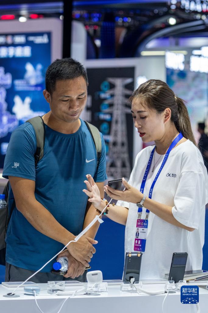 8月16日,來自廣東的客商(左)在第七屆中國—南亞博覽會(huì)科大訊飛展位了解翻譯設(shè)備。 新華社記者 胡超 攝