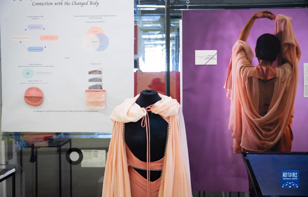 這是8月15日在以色列比撒列藝術(shù)設(shè)計(jì)學(xué)院畢業(yè)展上拍攝的為乳腺癌患者設(shè)計(jì)的睡衣。