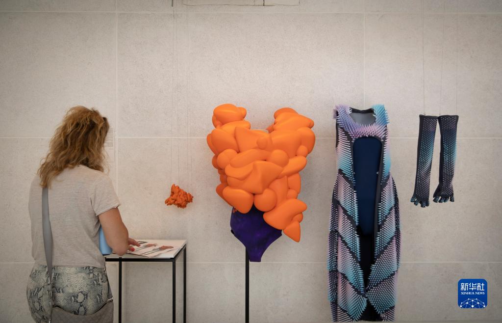 這是8月15日在以色列比撒列藝術(shù)設(shè)計學(xué)院畢業(yè)展上拍攝的用3D打印技術(shù)制作的服裝。