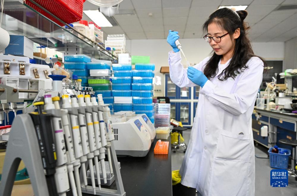 在中國科學(xué)院天津工業(yè)生物技術(shù)研究所實(shí)驗(yàn)室,宋皖博士在做人工合成己糖實(shí)驗(yàn)(8月13日攝)。