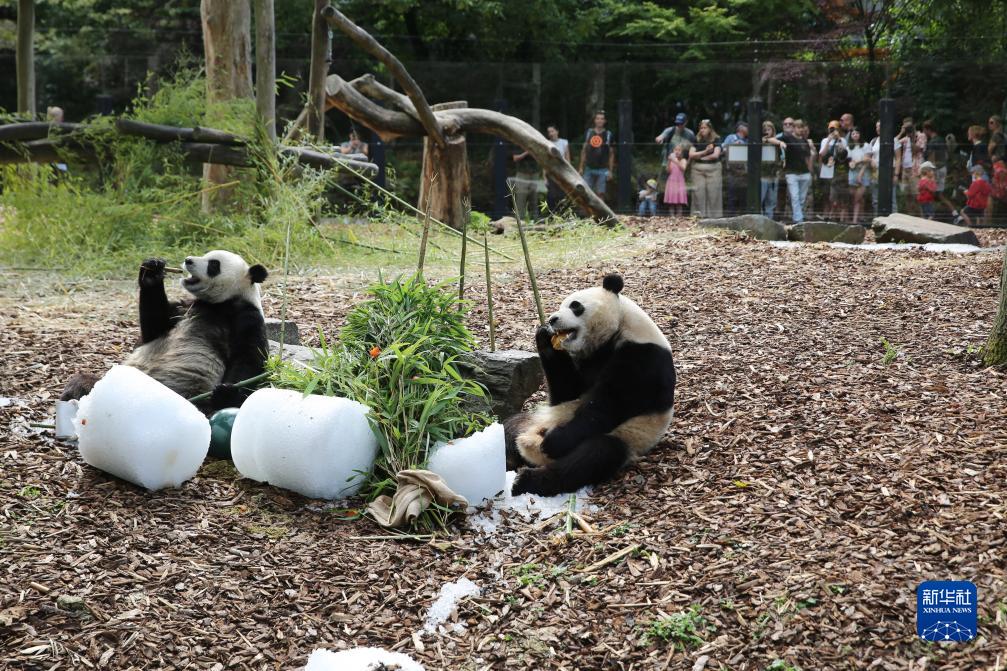 8月16日,在比利時布呂熱萊特的天堂動物園,大熊貓“寶弟”(左)、“寶妹”享用“生日大餐”。