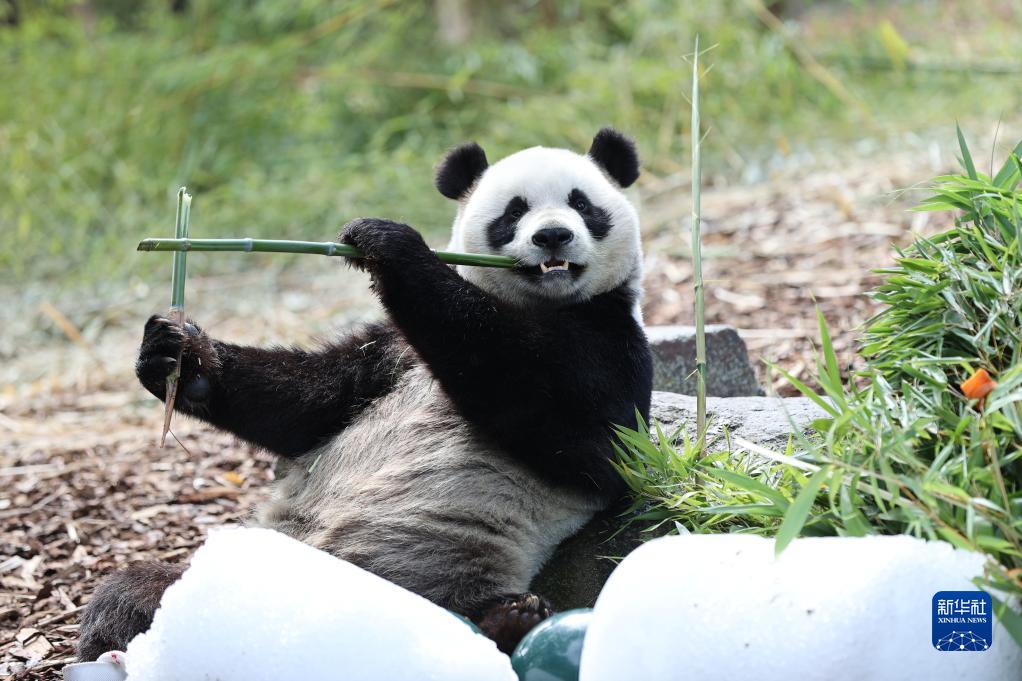 8月16日,在比利時布呂熱萊特的天堂動物園,大熊貓“寶弟”享用“生日大餐”。