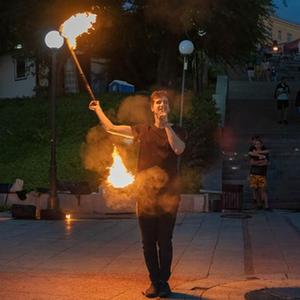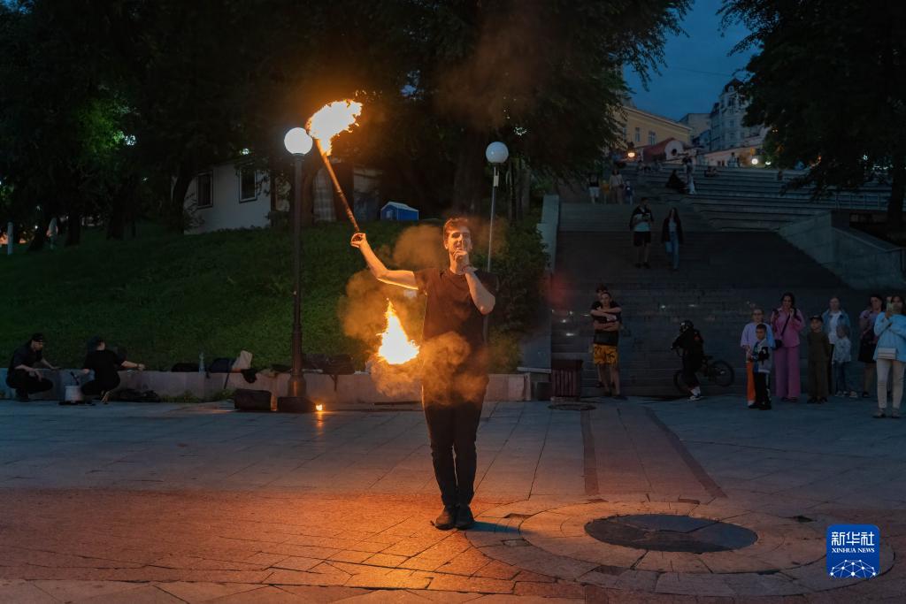 8月16日,一名男子在俄羅斯遠東城市符拉迪沃斯托克阿穆爾灣的廣場上表演火藝。