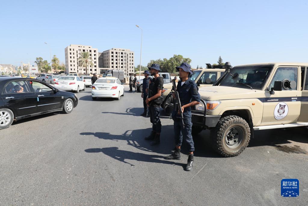 8月16日,利比亞沖突停火后,利比亞公共安全部門人員在的黎波里的艾因扎拉區保障安全。