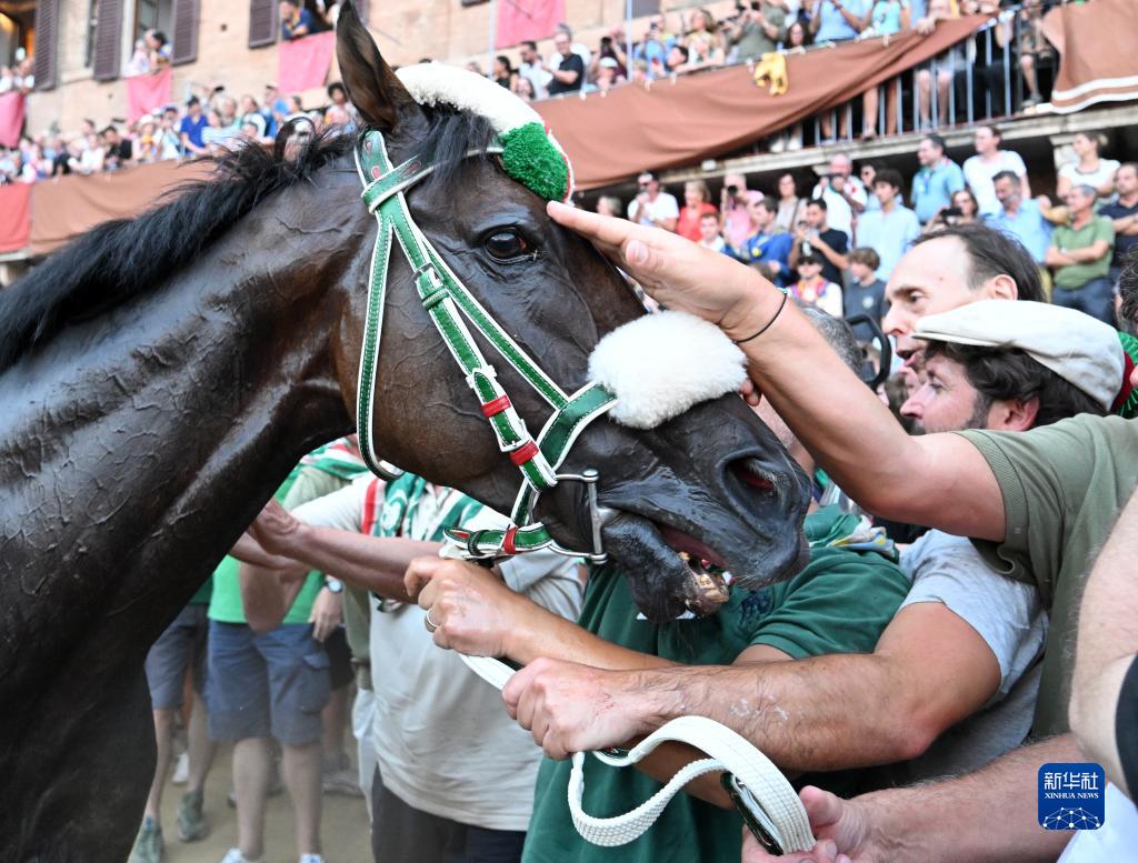 8月16日,在意大利錫耶納,人們撫摸獲勝馬匹。