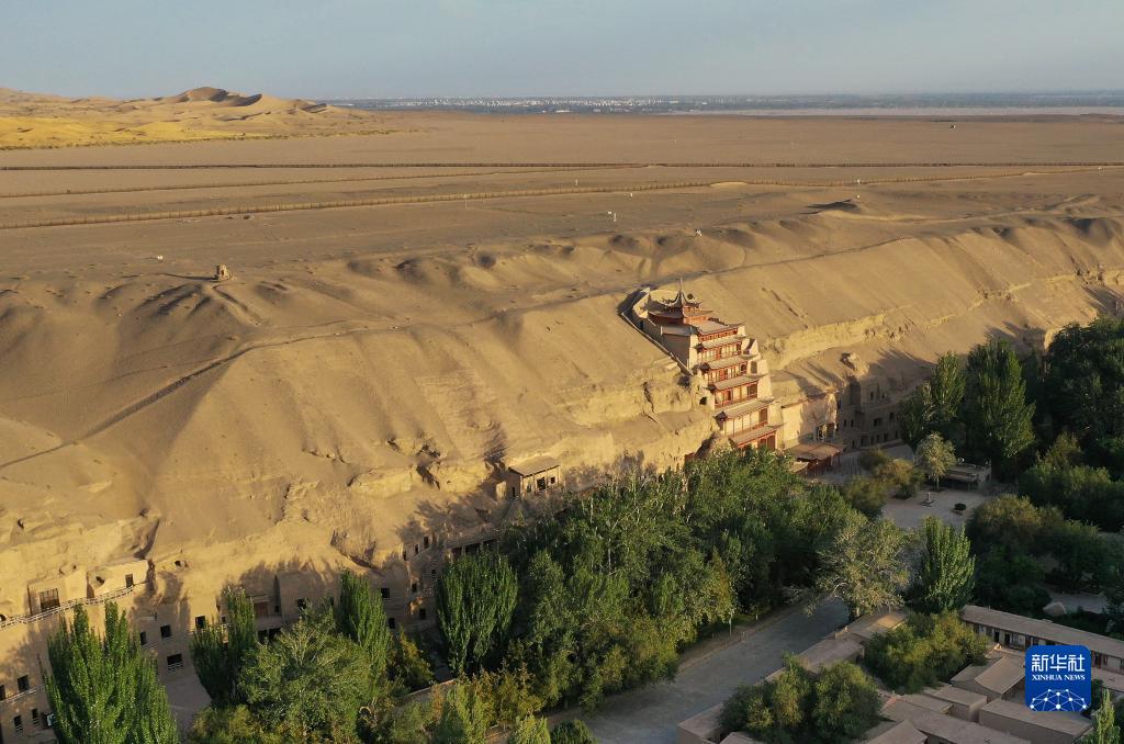 在敦煌莫高窟崖體頂部的戈壁帶和沙地上布設有風沙、環境等多種監測設備以及安防監控系統,為莫高窟的保護提供了實時數據支持和安全保護屏障(8月4日攝,無人機照片)。