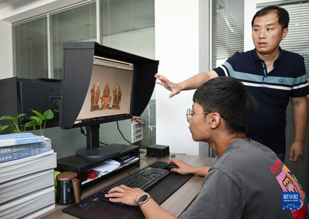 在敦煌研究院文物數字化研究所內,工作人員展示對莫高窟彩塑進行三維重建后的成果(8月3日攝)。