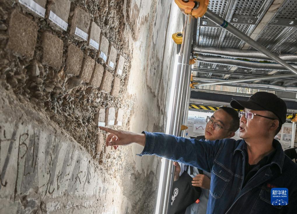 在敦煌莫高窟正在保護修繕的第55窟內(nèi),文保工作者對現(xiàn)場模擬試塊進行對比測試(8月3日攝)。