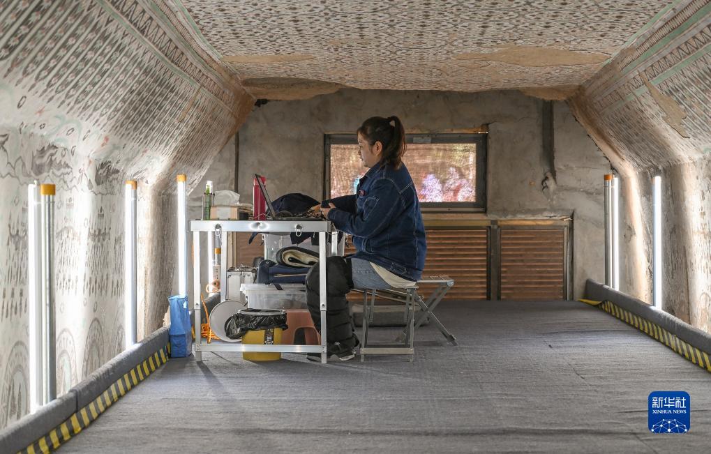 在敦煌莫高窟正在保護修繕的第55窟內,一位文保工作者對采集的數據進行整理(8月3日攝)。